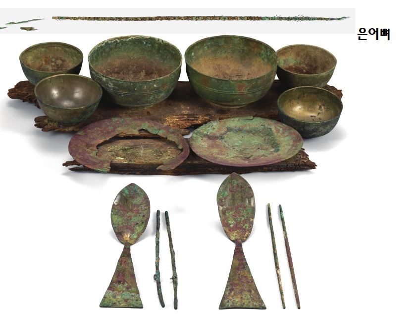 맨 앞쪽에는 청동접시 2점이, 그 뒤로는 청동그릇과 청동잔이 2점씩 배치됐다. 무덤방과 무덤길에 흩어져있던 청동숫가락 및 젓가락 1벌씩도 제사상과 관련된 유물인 것이 확실했다. 그런데 제사상에 놓인 청동그릇에서 세마리분의 은어뼈 등이 청색으로 변색된채 확인됐다. 무령왕과 왕비의 제사상에 은어를 올렸음을 알 수 있다.