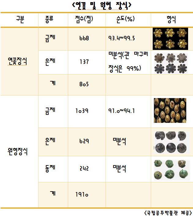 국립공주박물관이 세어본 금제와 은제, 동제 등 다양한 연꽃장식의 수는 805점에 달했다. 이중 금제 연꽃은 668점, 은제 연꽃은 137점이었다. 금제의 경우 지름이 3.8~4㎝ 되는 큰 것도, 1.2~2㎝ 정도인 작은 것도 있었다. 금제 연꽃장식의 금함유량은 93.4~94.1%(큰 것)과 98.8~99.5%(작은 것)이었다.