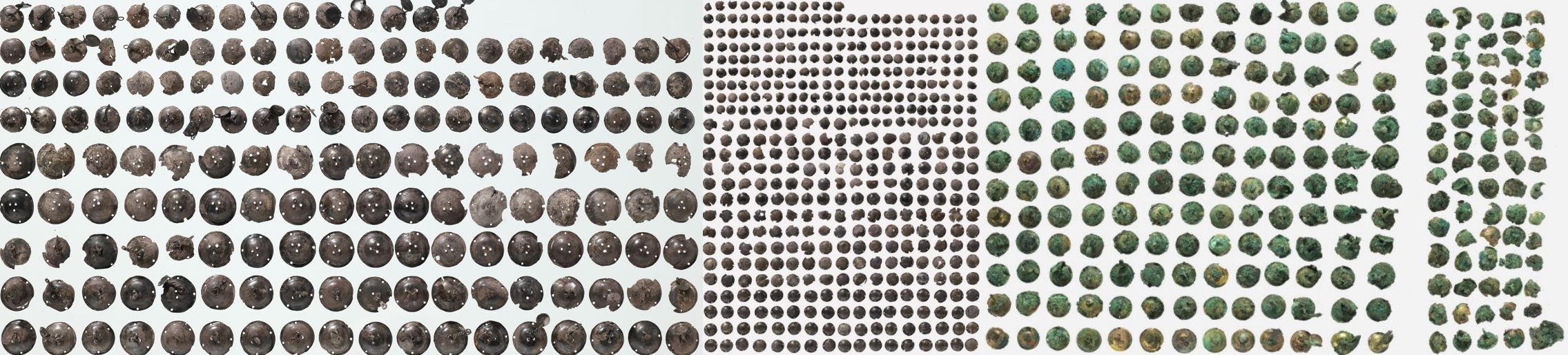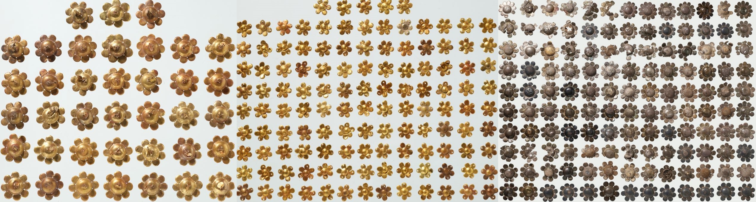 무덤에서는 이런 ‘연꽃장식’ 뿐 아니라 1.4~1.9㎝ 직경의 금·은·동제 ‘원형 장식’도 1910점 수습됐다. 원형장식은 금제(1039점)·은제(629점)·청동제(242점)로 구분된다.