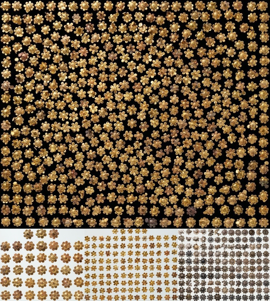 무령왕릉 안에서 확인된 황금 연꽃 모양의 장식. 금함유량은 93.4~94.1%(큰 것)과 98.8~99.5%(작은 것)로 순금(24K)이라 해도 과언이 아니다. 순금 연꽃 668점, 은연꽃 137점 등 805점의 연꽃 장식이 수습됐다.국립공주박물관 제공