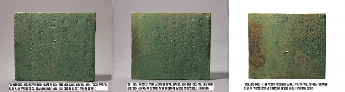 무령왕릉은 삼국시대 왕릉 가운데 신원이 밝혀진 능이다. 무덤의 주인공이 사마왕, 즉 무령왕과 무령왕비임을 분명히 밝힌 묘지석이 나왔다. 또한 무덤조성을 위해 토지신에게 땅을 구입했다는 ‘매지권’까지 보였다.|국립부여박물관 제공