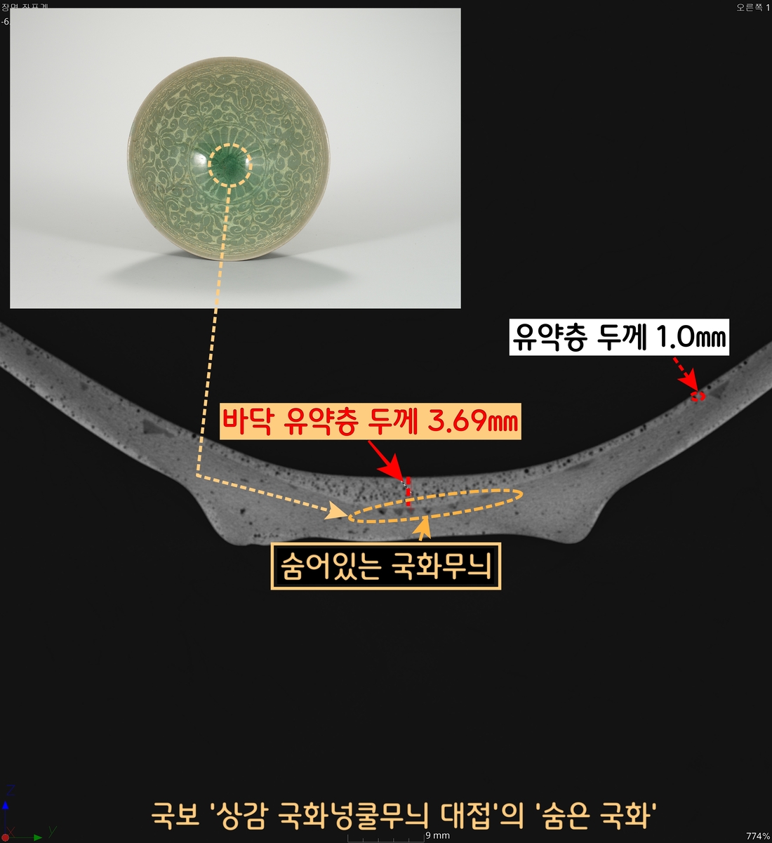 이 사발의 외부에 국화무늬가, 내부에 넝쿨무늬가 장식돼있다. 궁금증이 생긴다. 고려 시대 장인이 애써 그렸을텐데 왜 보이지 않았던걸까. 유약 때문이었다. 분석결과 그릇 바닥으로 내려갈수록 유약의 두께가 두꺼워지고(1.00㎜), 내부 바닥에는 아예 유약층이 고여있었다. 그 유약층 때문에 고려 장인이 새긴 ‘회심의 마무리’ 솜씨가 ‘아뿔싸!’ 가려진 것이다. 그걸 CT가 잡아냈다.