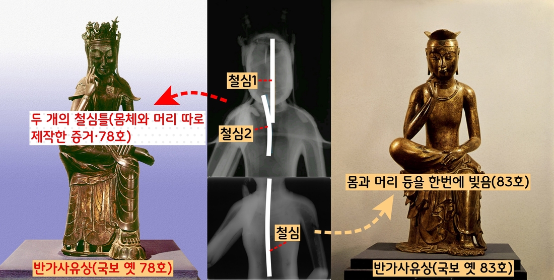 내부의 칠심틀이 분리되었다는 사실도 확인됐다. 즉 78호 반가사유상은 밀랍주조법으로 제작됐다. 철심틀에 점토로 불상의 원형을 정교하게 빚고 그 위에 밀랍을 입혀 원형대로 조각한 다음 재차 점토를 바른 후 청동쇳물을 부어 주조하는 기법이다. 그런데 철심틀이 분리되었다면 점토로 맨처음 형상을 만들 때 몸체와 머리 부분을 각각 따로 만들어 붙였다는 뜻이다. 반면 78호보다 50년 정도 늦게 제작된 83호 반가사유상은 1개의 철심틀로 머리와 몸체 등을 한번데 빚었다.