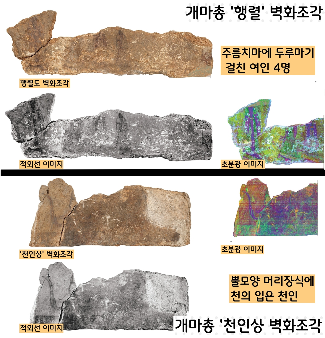 이밖에 국립중앙박물관이 소장중인 고구려 벽화 개마총의 조각편을 적외선 및 초분광(가시광선 너머 적외선 영역을 수백개의 구역으로 나눠 잘게 쪼개는 기술) 촬영 등을 통해 넓은 띠 안에 구름 무늬와 함께 해 안의 삼족오가 그려진 것을 확인했다. 또 천인상 벽화에서는 뿔 모양의 머리장식에 펄럭이는 천의를 입은 사람과, 양손을 다소곳이 모아 쥐고 주름치마에 두루마기를 걸친 여성 4명이 관찰됐다.