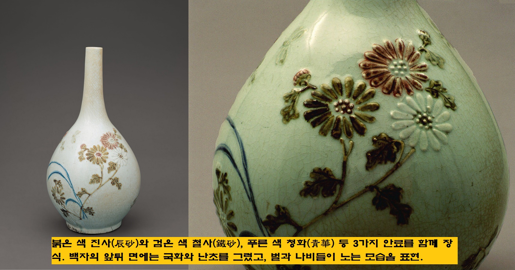 보기에도 대단한 백자였습니다. 붉은 색 진사(辰砂)와 검은 색 철사(鐵砂), 푸른 색 청화(靑華) 등 3가지 안료를 함께 장식했습니다. 백자의 앞뒤 면에는 국화와 난초를 그렸으며, 벌과 나비들이 노는 모습이 표현되어 있었습니다.
