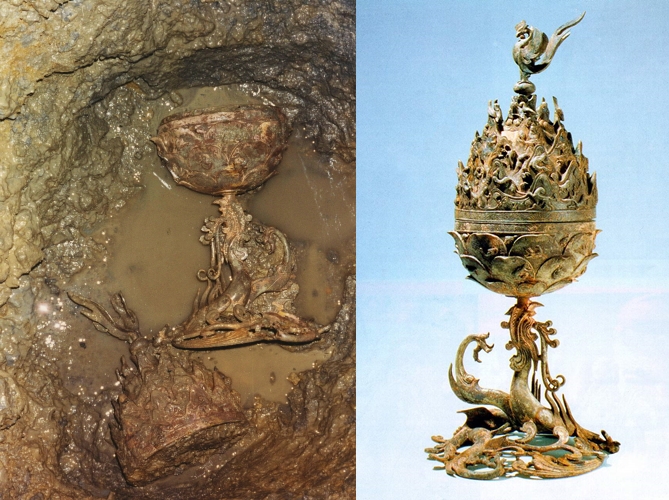 여기서 슬슬 피어나오는 궁금증을 주체할 수 없습니다. 이 대향로는 왜 사찰의 공방지 바닥에 있은 구유형의 나무물통에 은닉된 모습으로 발견됐을까요.