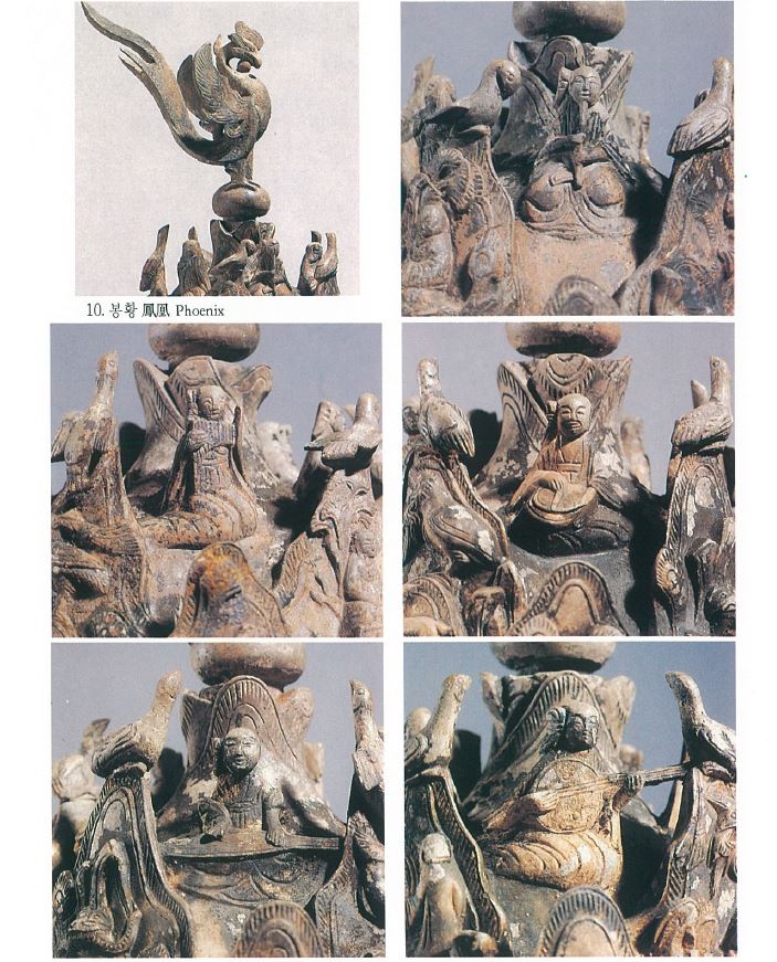 뚜껑 정상부에는 5명의 악사가 각각 금(琴), 완함(阮咸·당나라 때의 현악기로 비파의 일종), 동고(銅鼓·꽹과리), 종적(縱笛·관악기), 소(簫·피리의 일종) 등 5가지의 악기를 실감나게 연주하고 있었습니다. 뚜껑 전체는 삼신산 형태의 4∼5단이었는데요. 첩첩산중의 자연세계를 표현한 거죠.
