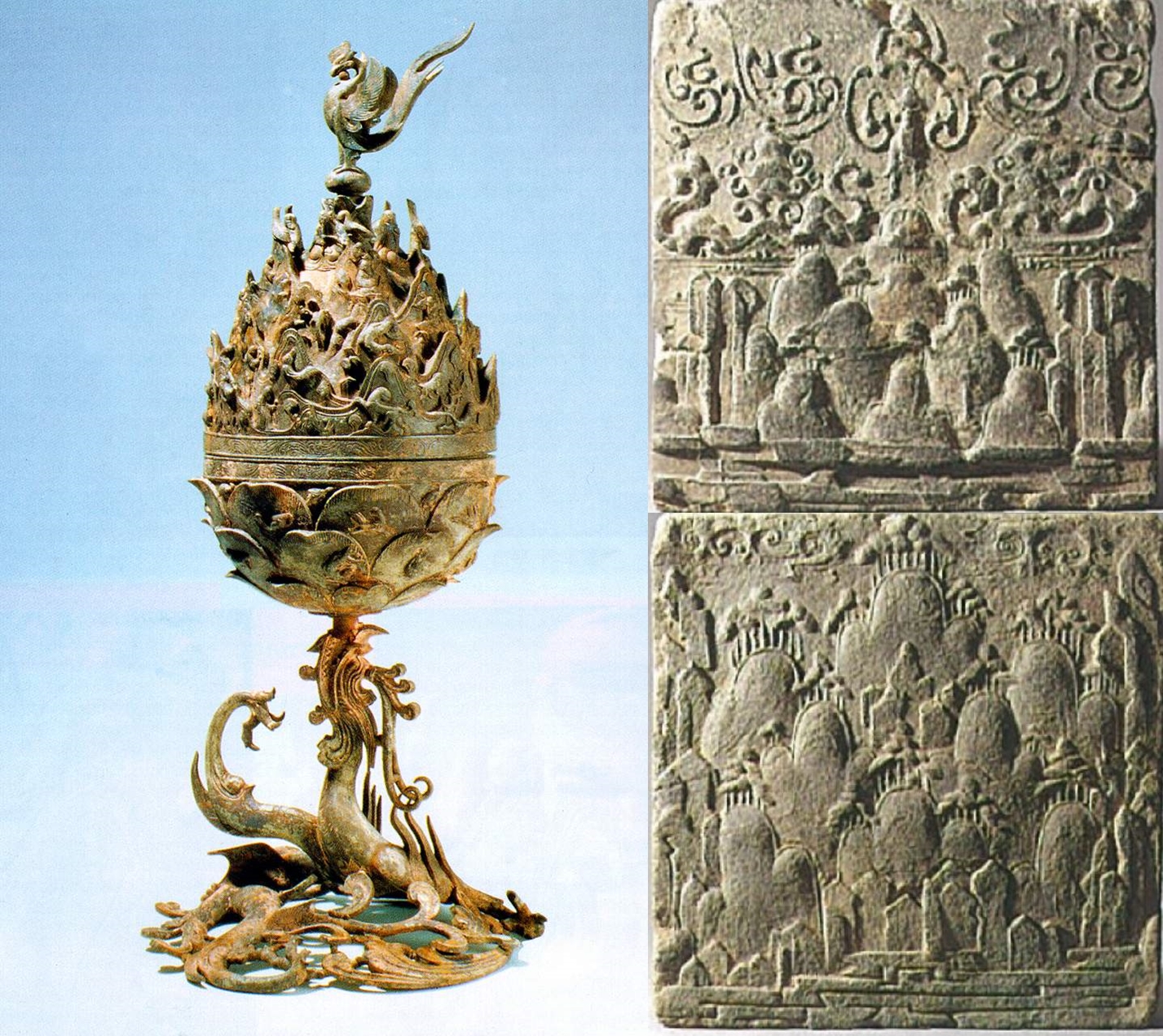 문양을 봐도 그렇습니다. 무령왕릉에 출토된 동탁은잔(銅托銀盞), 그리고 부여 외리에서 나온 백제 문양 전(塼·전돌) 등은 이 금동대향로와 거의 일치하는 박산표현이 있습니다. 대향로가 중국의 영향도 받았을 수 있지만 결국 계승은 한반도에서 계승되었다는 거죠. 5~6세기 신라시대 토기와 금속기, 부안 죽막동 출토 백제토기 등에서 금동대향로와 비슷한 표현이 보인다는 겁니다. 결국 이 향로는 백제인들의 뛰어난 예술적인 감각과 독창성이 아름다운 연꽃으로 화생했음을 만천하에 알린 걸작품이라는 거죠.