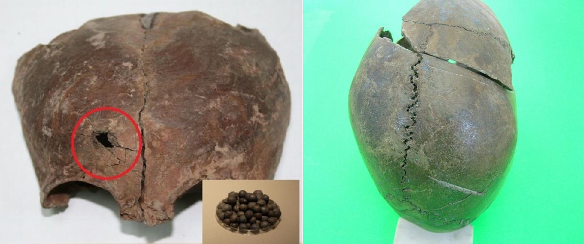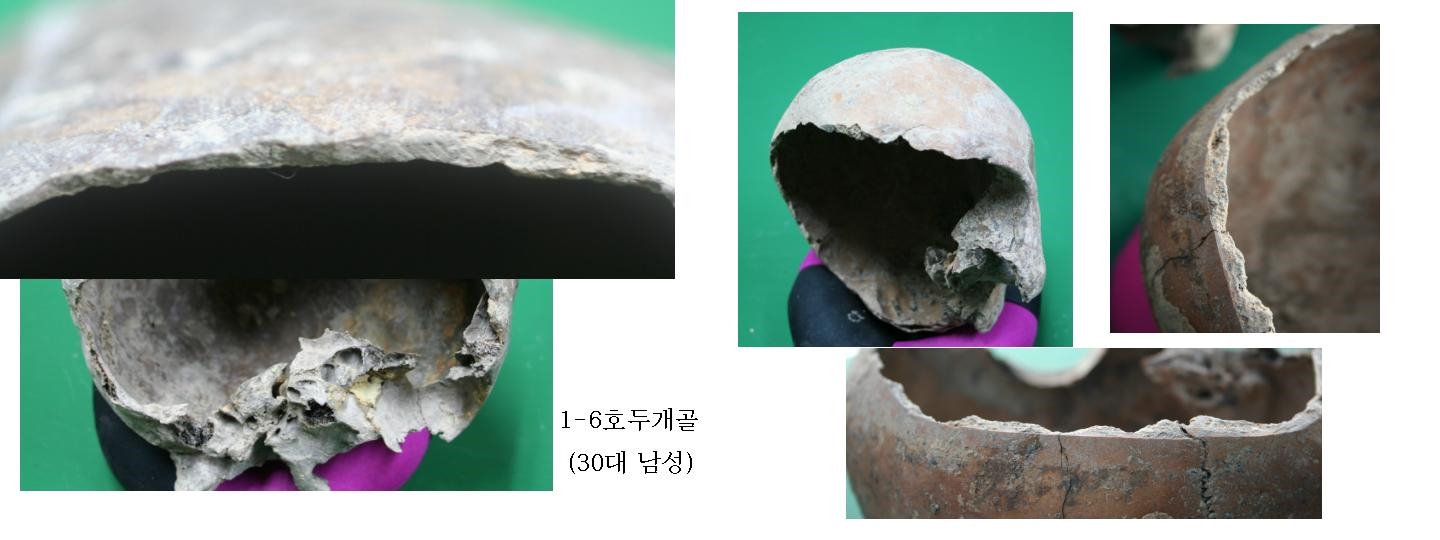 이 뿐이 아니구요. 남성의 두개골 분석에서도 뒤에서, 혹은 앞에서 칼로 벤 흔적이 남아있는데요. 어떤 경우엔 칼로 베인 것 같기는 한데 그 상처의 단면이 반듯하지 않는 인골들이 있었습니다. 이것은 칼이 아니라 다른 무기로 베었다는 소리죠. 이밖에 두개골이 함몰된 인골이 남녀 1개체씩 확인됐습니다.