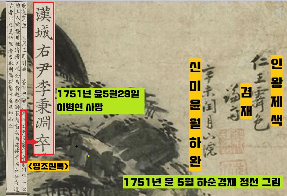 마침 <영조실록>에 “이병연이 1751년(영조 27년) 윤 5월 29일 사망했다”는 부음기사가 보이구요.