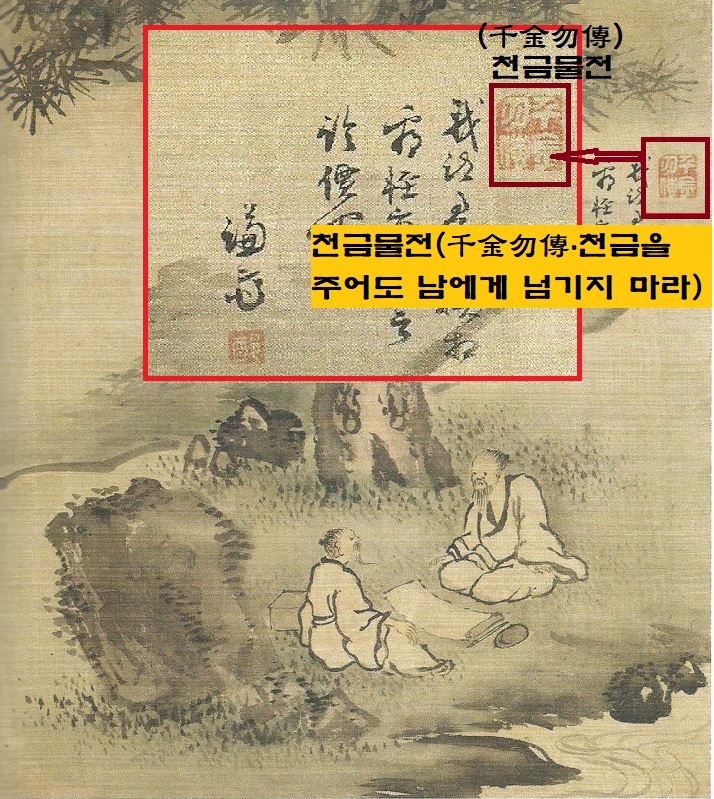 ‘자네의 그림과 나의 시를 바꾸자’(詩畵換相看)’는 사천의 편지글이 적힌 그림인데요. 그 옆에 ‘천금을 준다 해도 남에게 넘기지 않는다’는 ‘천금물전(千金勿傳)’이라는 도장까지 찍혀있습니다. 평생 나눠온 ‘우정을 결코 돈으로 바꿀 수 없다’고 다짐한 거죠.