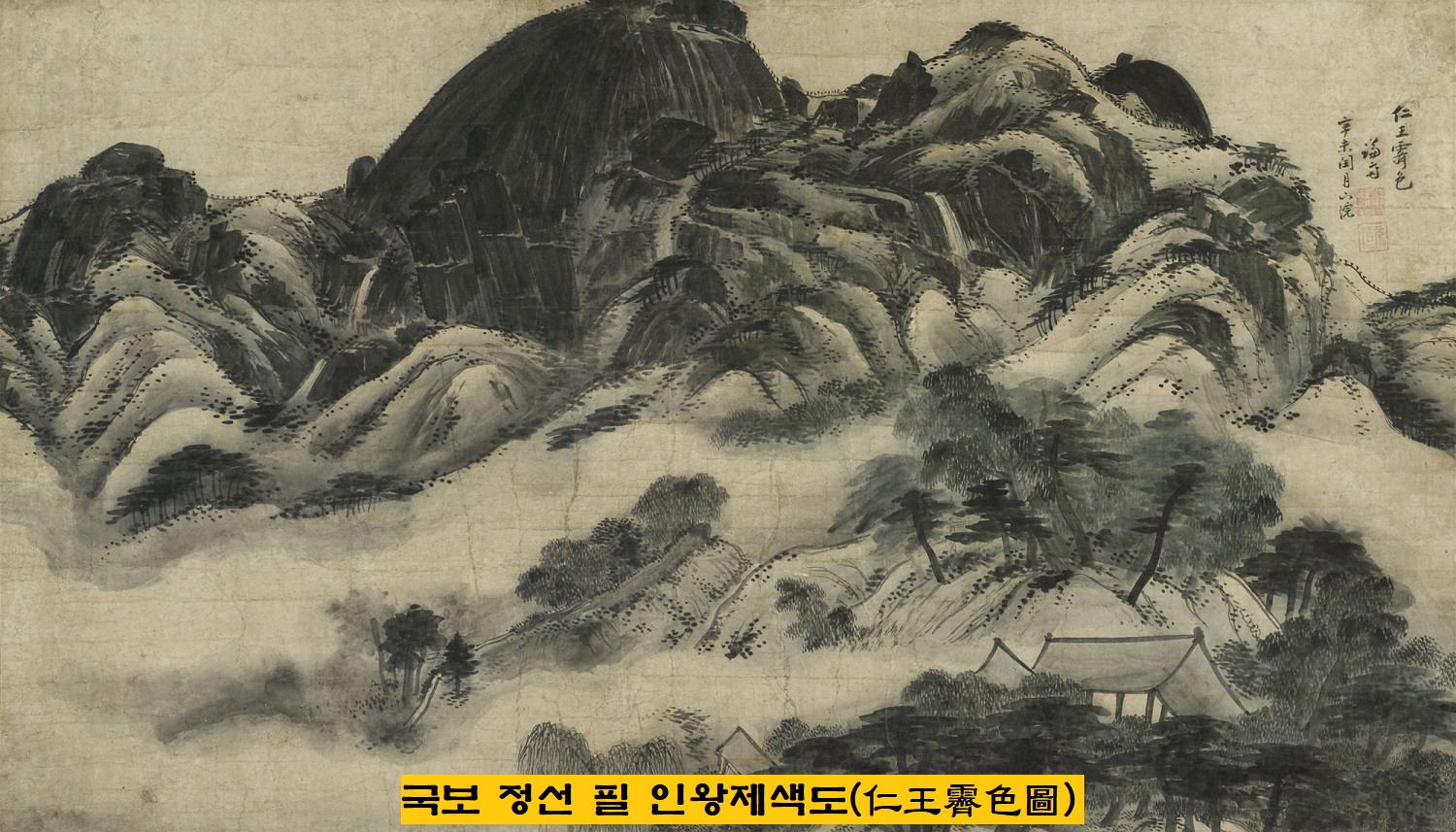 ‘인왕제색도(仁王霽色圖)’는 겸재 정선(1676~1759)의 76세 작품이죠. 한여름 소나기가 지나간 뒤의 인왕산 풍경을 묵중한 필체와 대담한 배치를 통해 사실적으로 그려냈고요. ‘금강전도’와 함께 겸재의 대표적인 진경산수화라는 평을 받고 있습니다.