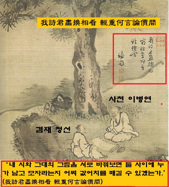 “소리울림은 고요한데 글의 꾸밈과 생각이 그윽하고 묘한 것은 겸재 노인의 ‘그림시’요, 쇠와 돌이 쨍그렁하듯 핍진한 것은 사천선생의 ‘시그림’이다… 사천이 바라보면 겸재의 그림이 바로 시이고, 겸재가 살펴보면 사천의 시가 바로 그림이다.”