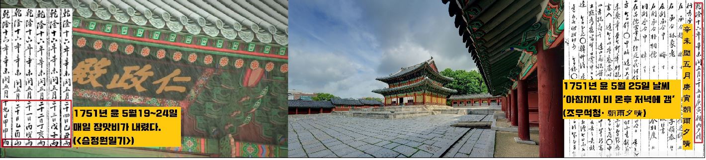 이와 관계된 자료가 또 있답니다. 미술사학자인 오주석(1956~2005)은 1751년 윤 5월 말 <승정원일기>에 기록된 ‘날씨란’에 주목했는데요. 즉 <승정원일기>에 따르면 음력 5월 19일부터 24일까지 매일 비가 내렸습니다. 날씨란에 6일 연속 ‘우(雨)’라 했습니다. 그런데 25일자 ‘오늘의 날씨란’을 보니 ‘조우석청(朝雨夕晴)’, 즉 ‘아침(朝)까지 비가 내렸다가(雨) 저녁(夕)에 갰다(晴)’고 했습니다. 사천 이병연이 사망한 날짜는 4일 뒤인 29일이었구요. 그래서 이런 해석이 가능하다는 겁니다.