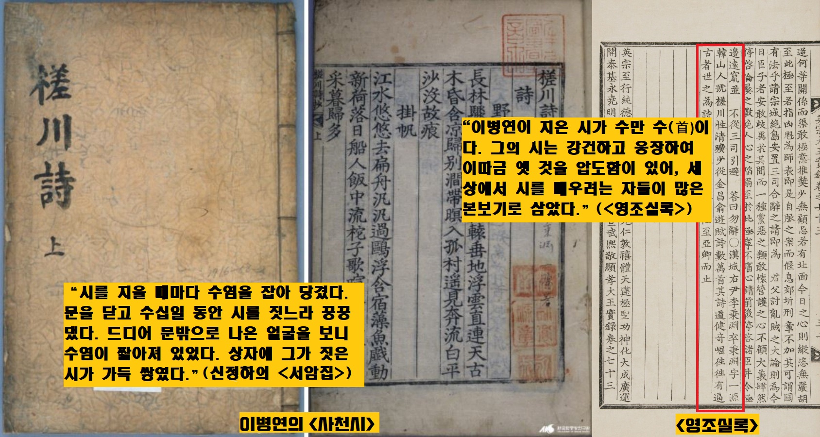 “시 한 구절을 만들 때마다 수염을 잡아당겼다”면서 “수십일 동안 끙끙대며 시를 짓고 난 사천의 수염이 남아나지 않았다”(신정하·1680~1715의 <서암집>)는 기록도 있습니다. 수염을 다 뽑을 정도로 치열하게 시를 지었다는 겁니다.
