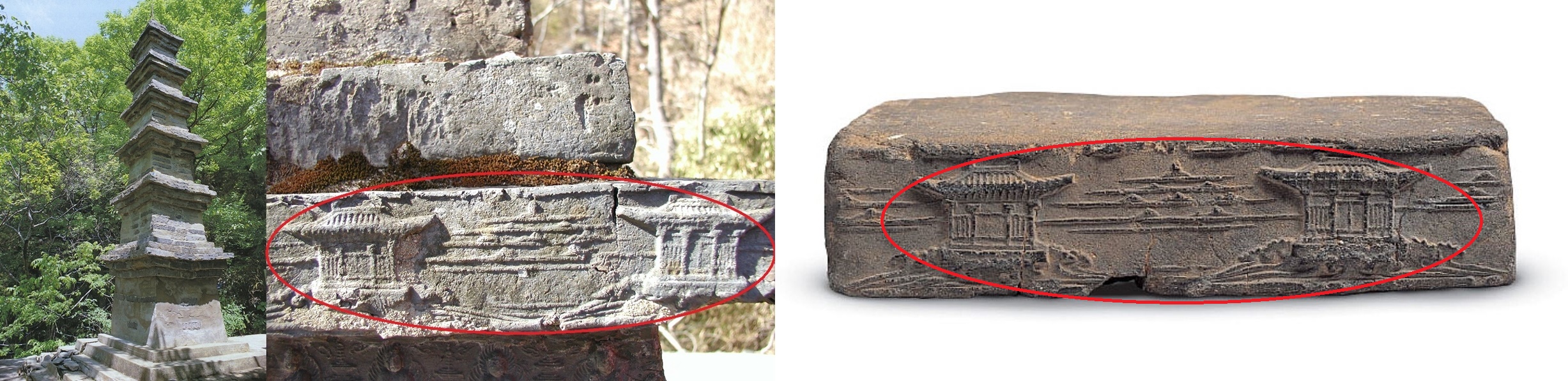 전돌 표면에 정면 3칸짜리 기와 건물 2채가 보인다. 높은 축대 위에 자리잡고 있어서 그런지 무척 화려해보인다. 지붕에는 안쪽으로 크게 휘어진 모양의 치미(지붕 양끝의 장식기와)도 보인다. 김유식 국립제주박물관장은 “건물 양쪽의 치미는 물론이고, 지붕의 기왓골까지 구체적으로 묘사하여 통일신라시대 건축물을 보는 듯 하다”고 설명한다. 바로 여기서 아주 흥미로운 관전포인트가 있다.