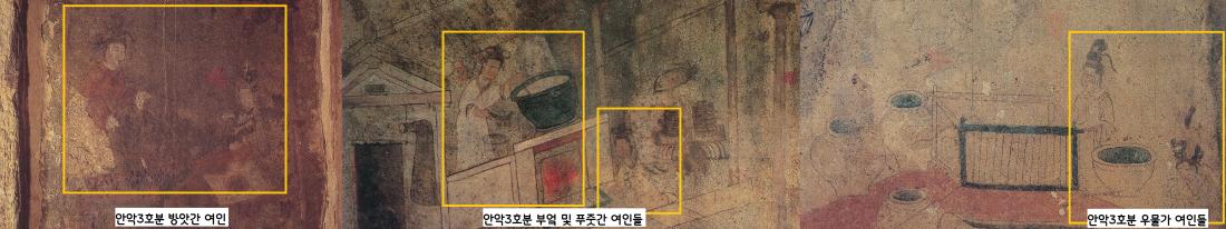 주방 및 푸줏간, 우물가, 방앗간 등에서 일하는 여인들의 헤어스타일도 화려하다. 안악3호분 시대, 즉 4세기 중반을 풍미한 고구려인의 헤어스타일을 짐작해볼 수 있다.