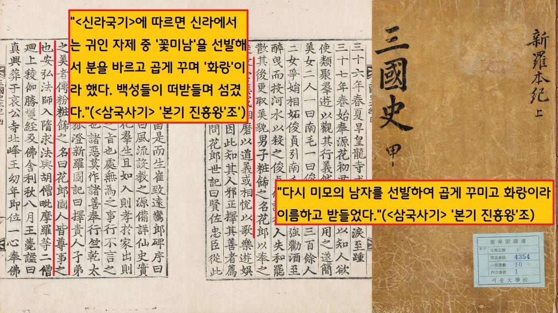 <삼국사기>는 <신라국기>를 인용하면서 ‘신라가 귀인 자제 가운데 아름다운 이를 선발하여 분을 바르고 곱게 꾸며 이름을 화랑이라고 했고, 나라사람들이 모두 떠받들며 섬겼다”고 전했다.|규장각 한국학연구원 자료