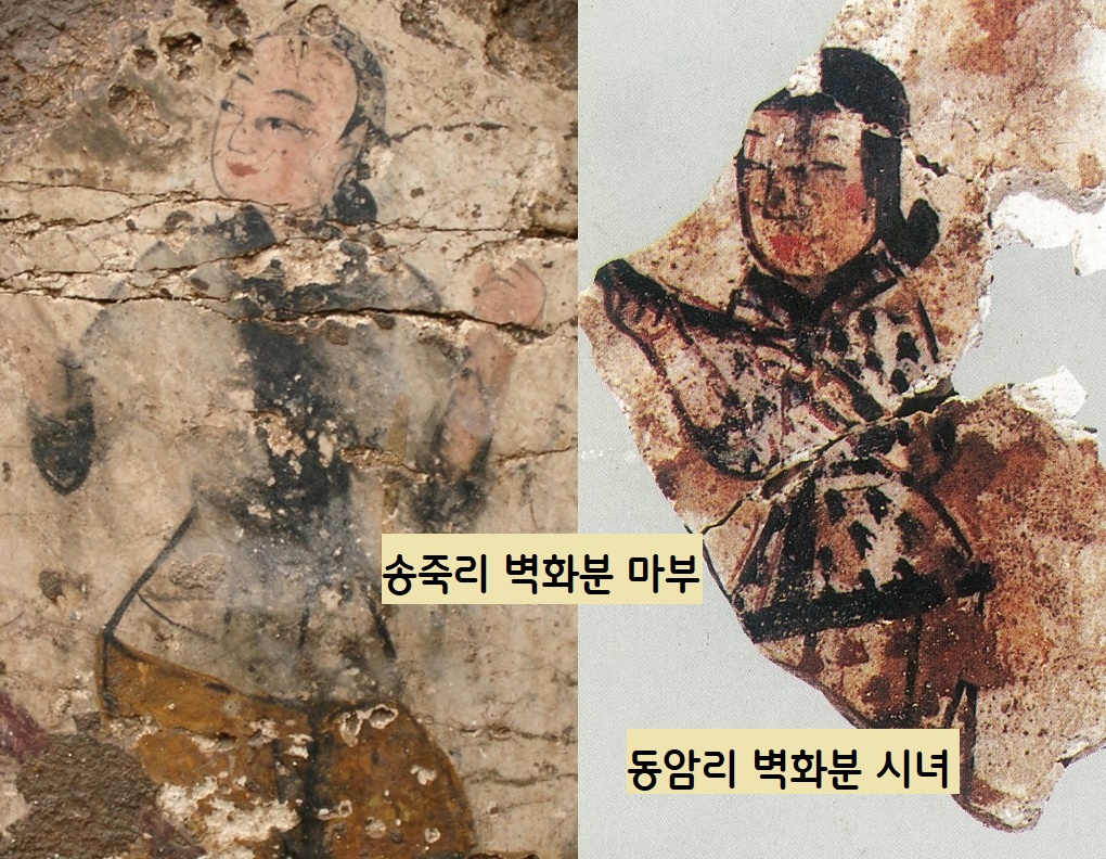수산리고분의 남자시종들(왼쪽 사진)은 보기에도 맵시있고 멀끔한 꽃미남들이다. 송죽리 고분의 ‘마부’는 여성의 미모가 연상될 정도로 허리가 잘룩하고 얼굴선이 곱고 희며 입술은 붉다. 그러나 ‘마부’인만큼 남성일 가능성도 크다.