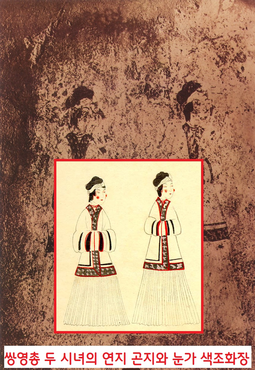 일제강점기에 벽화를 보고 그린 남포 쌍영총 인물의 모사도. 두 여인(시녀로 추정)의 볼과 입술에 연지를 바르고 눈썹 밑에 짙은 색조 화장을 했다. |전호태 교수 설명