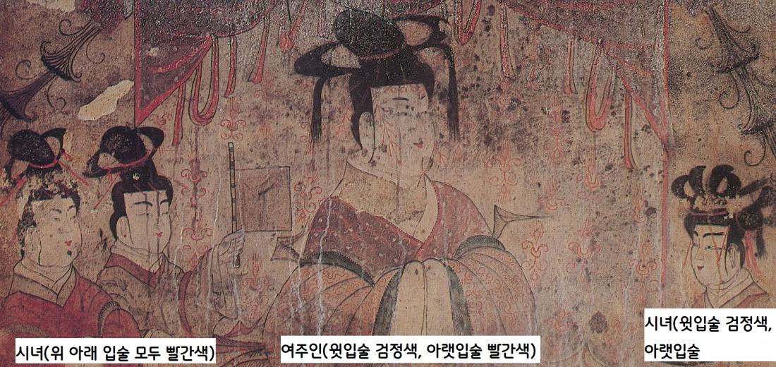 357년에 조성된 안악3호분의 여주와 시녀 일부는 윗입술은 검정색, 아랫입술은 빨간색으로 칠했다.|전호태 교수 설명