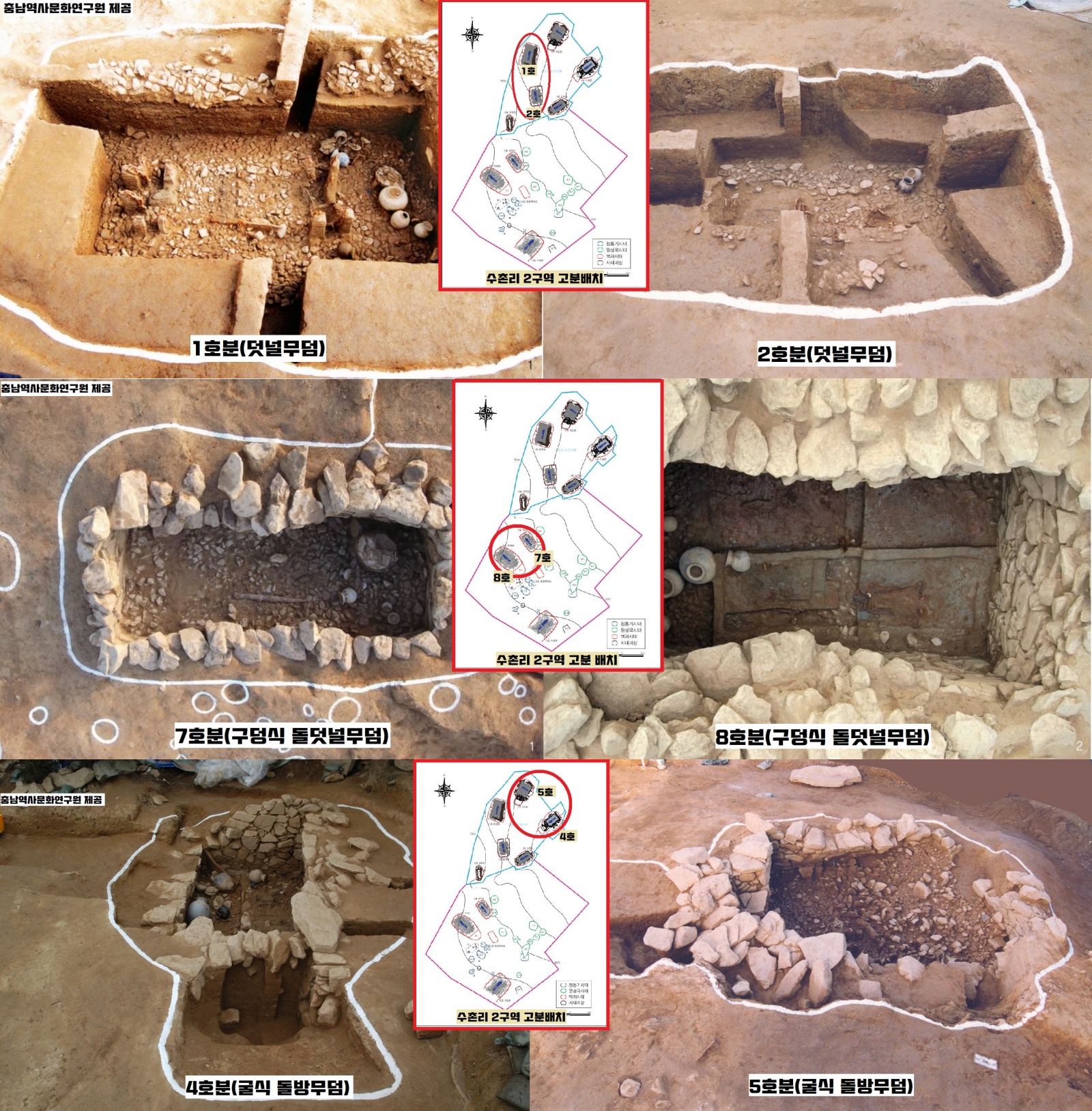 인접한 곳에서 같은 양식끼리 조성된 1~2호(덧널무덤)과 7~8호(구덩식돌덧널무덤), 4~5호(굴식돌방무덤)가 그런데요.