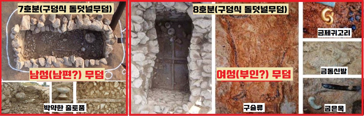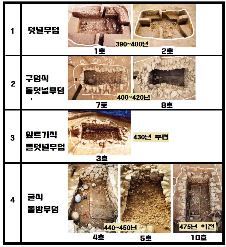 정리하자면 1~2호(덧널무덤·390~400년)→7~8호(구덩식 돌덧널무덤·400~420년)→3호(앞트기식 돌덧널무덤·430년)→4~5호(굴식 돌방무덤·440~450년)으로 무덤 양식이 이어진 겁니다.