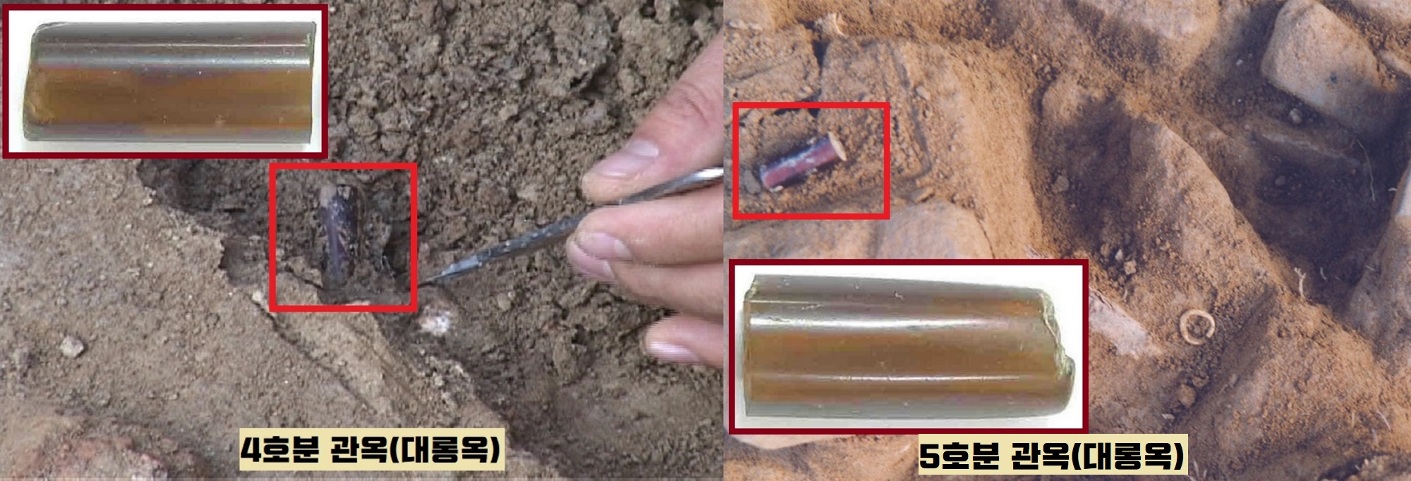 그런데 2004년 여름이었습니다. 수촌리 2구역의 출토유물을 정리하고 있던 발굴단(충남역사문화연구원) 소속 연구원이 깜짝 놀랄만한 발견을 했답니다. 즉 4호와 5호묘에서 부러진 관옥(구멍 뚫은 대롱 모양 구슬)이 1점씩 출토됐는데, 형태가 너무 비슷했다는 겁니다.