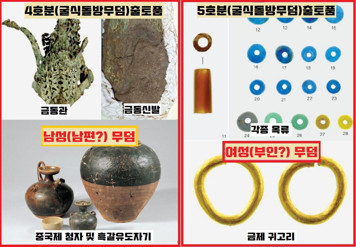 그 뒤를 이은 무덤이 3호(앞트기식 돌덧널무덤·횡구식석실묘)인데요. 돌덧널 무덤을 만든 뒤 앞쪽 벽을 터서 시신을 묻었죠. 이 3호 무덤의 연대는 430년 무렵으로 추정됩니다. 마지막으로 조성된 무덤은 4~5호(굴식돌방무덤·횡혈식석실분)인데요. 무덤방으로 들어가는 널길을 만든 뒤 돌로 쌓아 만들었죠. 440~450년으로 짐작됩니다.