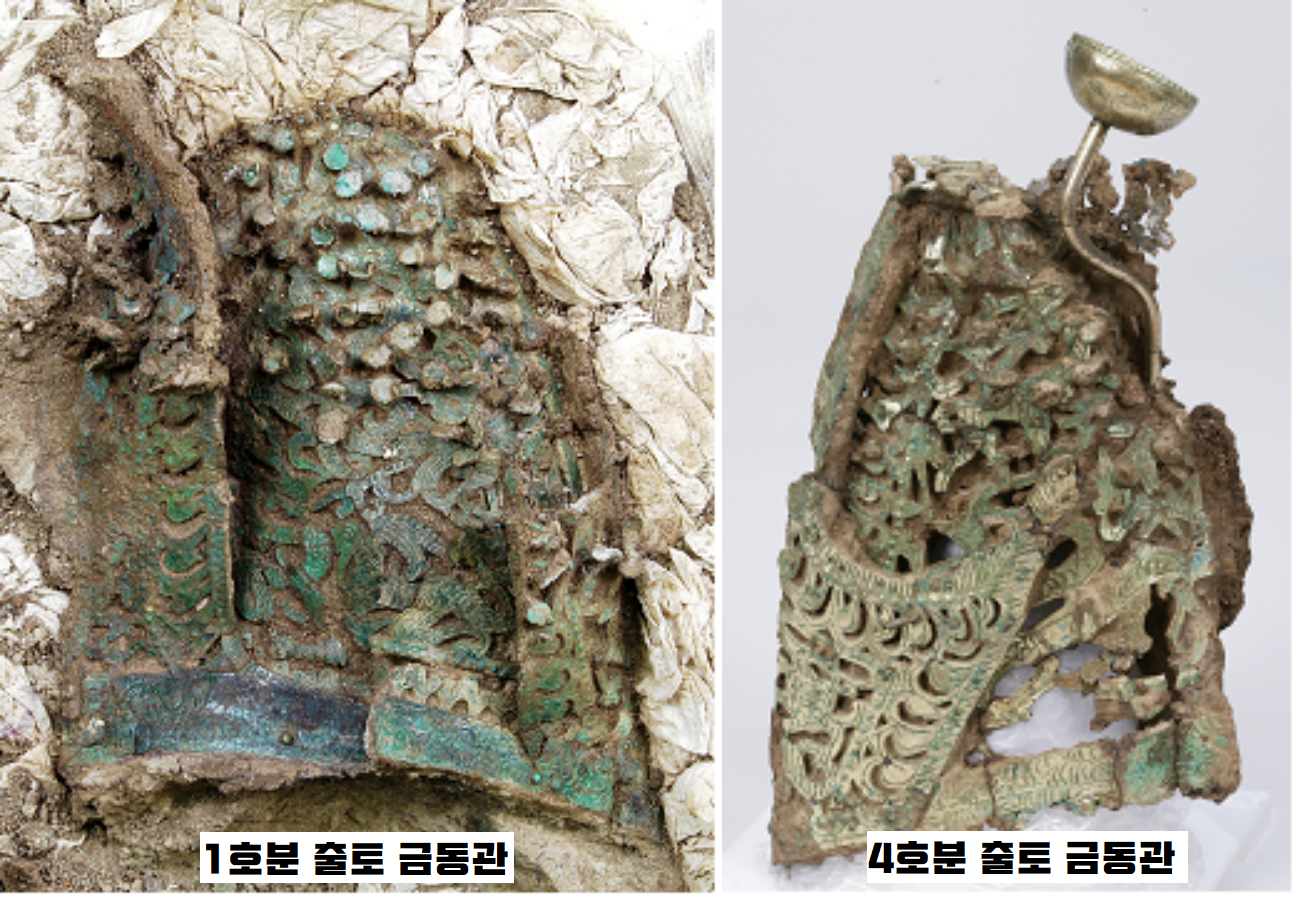 이어 실시된 2구역 조사에서는 불과 300평 남짓한 구릉 한편에서 고분 6기가 노출되었는데요. 거기서 금동관 2점과, 금동신발 3켤레, 중국제 흑갈유도자기 3점, 중국제 청자 2점, 금동허리띠 2점, 환두대도 및 대도 2점 등이 출토되었습니다.