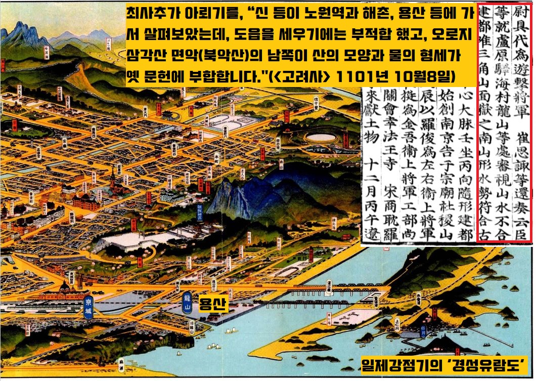 이렇게 용산은 예부터 한반도를 침략한 외국 군대의 주둔지였고, 그것이 미군기지로 이어진 겁니다. 결코 자랑스럽지 않은 아픈 역사를 간직하고 있는 땅이라는 뜻입니다. 풍수학의 관점에서 용산이 청와대와는 비교할 수 없는 길지라는 견해도 소개했는데요. 저는 1101년(고려 숙종 6) 10월 8일 남경의 지세를 조사한 문하시랑평장사 최사추(1036~1115)의 보고를 소개합니다.