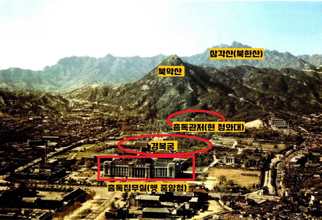 북악산-경복궁-광화문 라인은 백두산의 정기를 서울에 불어넣는 용의 목과 머리에 해당된다는거죠. 그런데 일제는 용의 입에 해당하는 경복궁 근정전 바로 앞에 총독 집무실(구 국립박물관)을 조성했고, 목에 해당되는 회맹단터에 총독관저(청와대)를 지었다는 겁니다. 그렇게 입을 틀어막고 목을 조른 결과가 어땠을까요. 자기 발등을 찍었다는 거죠.