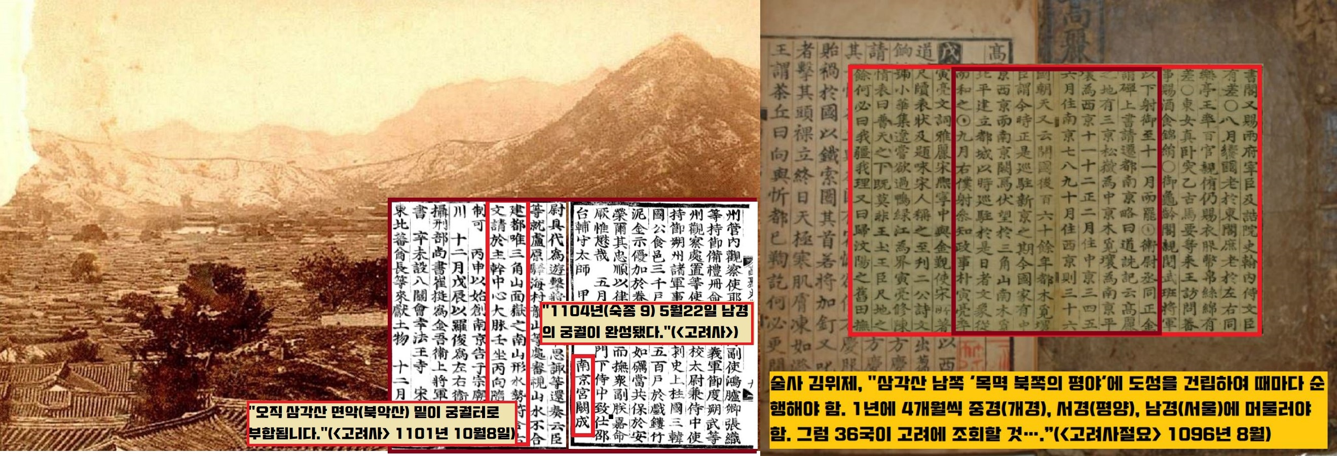김위제는 “임금이 해마다 중경(개경)과 서경(평양), 그리고 남경(서울)에서 4개월씩 머물면 36국이 조회한다”면서 “개국한 뒤 160년 후에 목멱양(남산 북쪽 평지)에 도성을 건설하고 1년에 4개월 동안 머무르시면 태평성대를 이룬다”고 주장합니다.