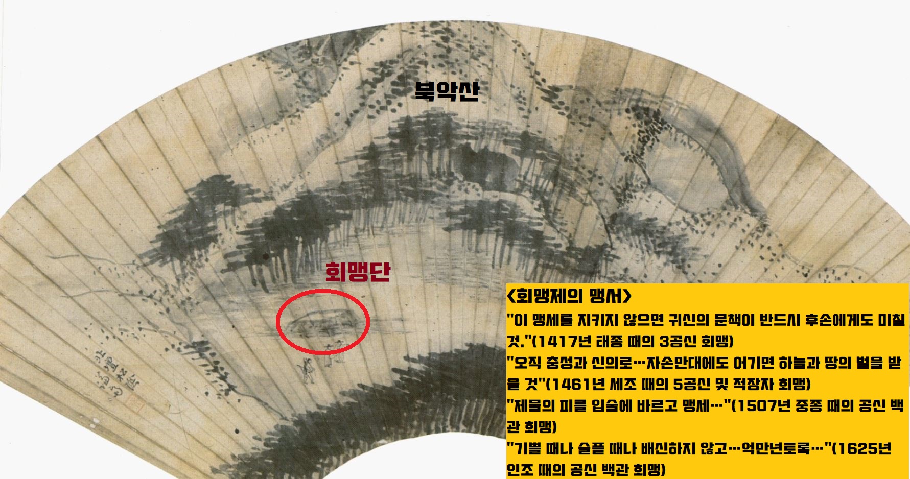 1·2차 왕자의 난으로 정권을 잡은 태종은 여러차례 공신회맹을 통해 충성서약을 받았는데요. 개국공신(1392)은 물론 1·2차 왕자의 난에서 공을 세운 정사공신(1398)과 좌명공신(1401)들이 5차례나 모여 충성을 다짐했죠. 1417년(태종 17) 4월 7일 회맹단(청와대터)에서 거행한 회맹은 특별했는데요. 개국·정사·좌명공신은 물론 그들의 적장자(아들)까지 총출동하여 충성을 다짐했습니다. 이들은 “만약 맹세를 바꾼다면 그 죄는 본인 뿐 후손에게도 미칠 것”이라고 맹약했습니다.
