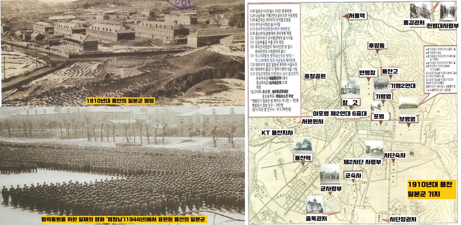 1904년 러·일 전쟁을 일으킨 일본군이 본격적인 한국의 무단통치를 위한 군사기지 설치를 하려고 용산땅을 수용했습니다. 한일의정서(1905년)를 내세워 부지 300만평을 헐값(평당 2전꼴)에 강제수용했고, 그중 117만평을 군용지로 사용했죠. 결국 한국을 강제병합한 일제는 조선주둔사령부를 설치하고 2만명의 병력을 주둔시켰습니다.