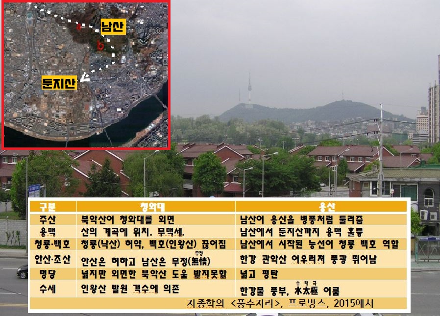 풍수와 관련해서 아주 흥미로운 자료가 보이더군요. 풍수학자의 책(지종학의 <풍수지리>, 프로방스, 2015)인데요. 용산이 풍수상 엄청난 길지라는 견해를 피력했더라구요. 즉 주산인 남산(해발 271m)이 용산(해발 79m)을 병풍처럼 둘러주고, 남산에서 둔지산(해발 65m, 48m)까지 용맥이 훌륭하며, 남산에서 시작된 능선이 크게 좌청룡·우백호를 형성하고, 한강~관악산이 어우러져 뛰어난 풍관을 이룬다는 겁니다.