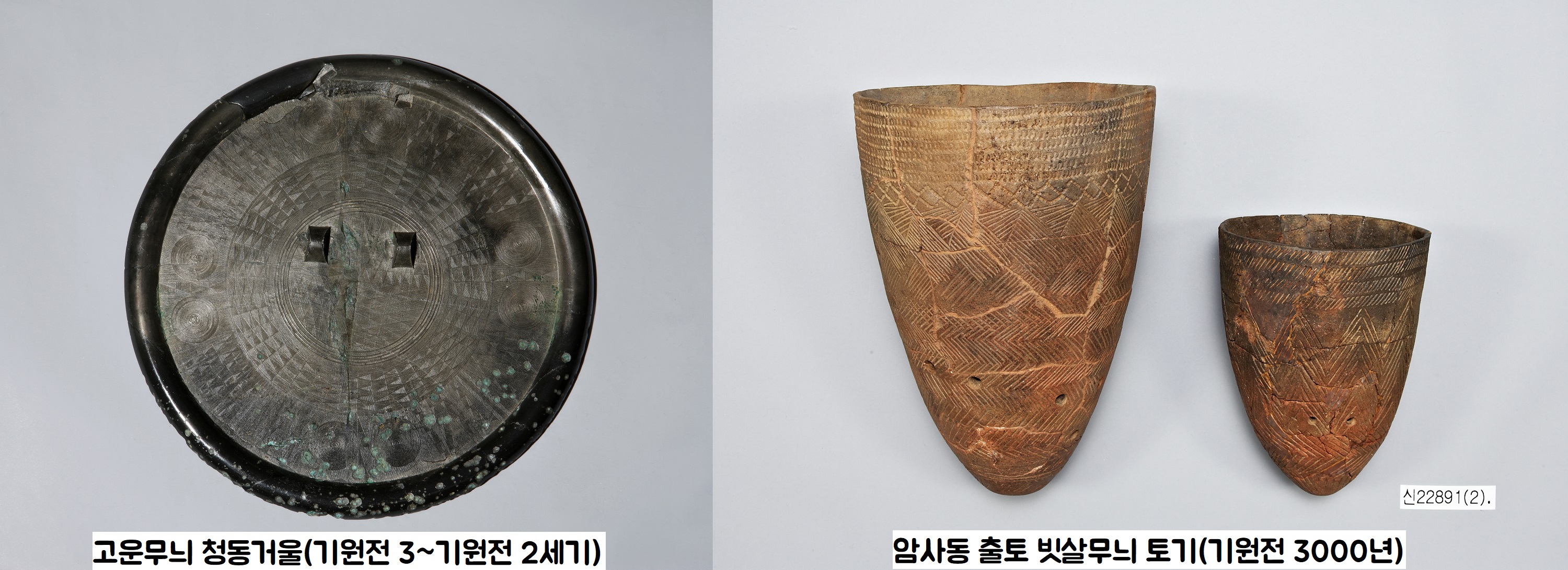 그렇게 제작한 거칠고 굵은 도기의 표면에 띠를 두르고, 손이나 새김도구로 쓱쓱 비교적 간단한 무늬를 냈을 것이다. 그럼에도 빗살무늬토기의 예술은 끊어지지 않고 면면이 이어졌다. 마침내 기원전 300~200년 쯤이 되면 0.3㎜의 극세선 예술을 선보인 고운무늬 청동거울(정문경 혹은 다뉴세문경)’로 정점을 찍었다. 요즘에는 고운무늬 청동거울의 무늬와 빗살무늬의 친연관계에 천착하는 연구가 주목을 끌기도 했다. 해수면의 상승과 하강에 따른 한강 유역의 문화상은 이렇게 일목요연하게 정리할 수 있다. 이기환 히스토리텔러