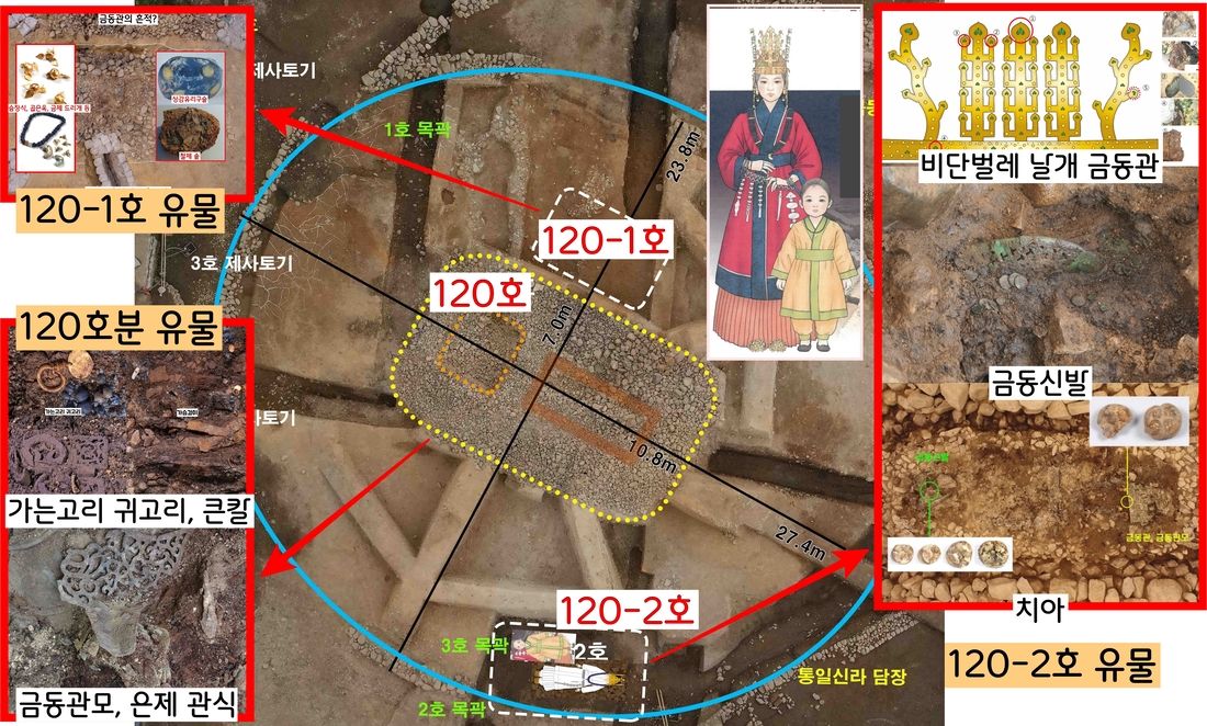 비단벌레 날개를 장식한 금동관이 발견된 경주 황남동 120-2호분과, 상감구슬 등이 확인된 120-1호분은 120호분에 딸린 무덤으로 안식되고 있다. 발굴 결과 덩이쇠를 깔고 금동관모를 쓴 120호분은 재력가 남편, 금동관을 쓴 120-2호분은 120호분의 부인이자 공주급 왕실여인, 120-1호분은 또다른 부인일 가능성이 제기되었다.