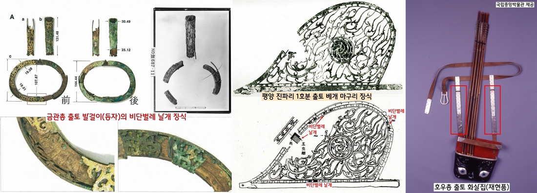 비단벌레 날개장식 유물은 1921년 경주 금관총에서 처음 확인됐다. 그것이 말에 오를 때 쓰는 발걸이다. 이후 평양 진파리 7호분 출토 배개 마구리 장식과, 경주 호우총 출토 화살통 등에서도 확인되었다.