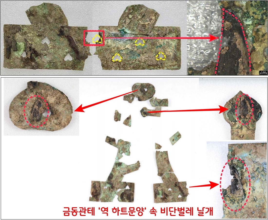 처음엔 금동관 곳곳에 뚫어놓은 ‘역 하트 모양’의 구멍에 흙이 붙어있는 줄 알았다. 그러나 보존처리 도중 이것이 비단벌레 날개임을 확인했다. 비단벌레 날개장식은 13곳에서 15장이 수착(흡착과 흡수가 동시에 진행된 상태)된 채로 발견됐다.|신라문화유산연구원 제공