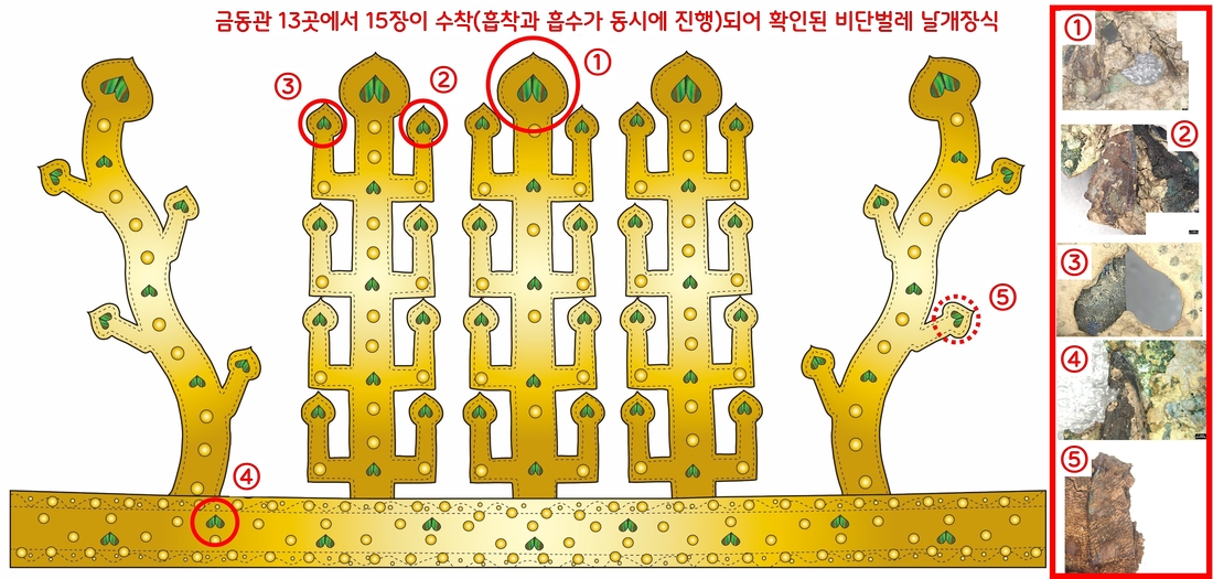 경주 황남동 120-2호 출토에서 확인된 비단벌레 날개장식(재현). 금동관 곳곳에 뚫어놓은 ‘역 하트 모양’의 구멍을 영롱한 빛깔의 비단벌레 날개로 메워 장식했다.|신라문화유산연구원 제공