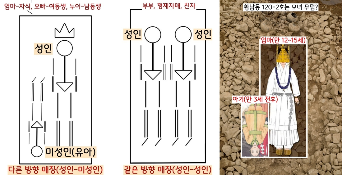 누운 방향이 반대인 경우 ‘성인-미성년자’로, 두 사람을 같은 방향으로 묻는 경우는 ‘성인-성인’ 구성이 대부분이라고 한다. 120-2호의 경우 머리방향이 반대인 12~15세 여성과 3세 전후의 아이는 혹시 모녀관계일 수 있다는 분석도 있다.|김재현 동아대교수 설명
