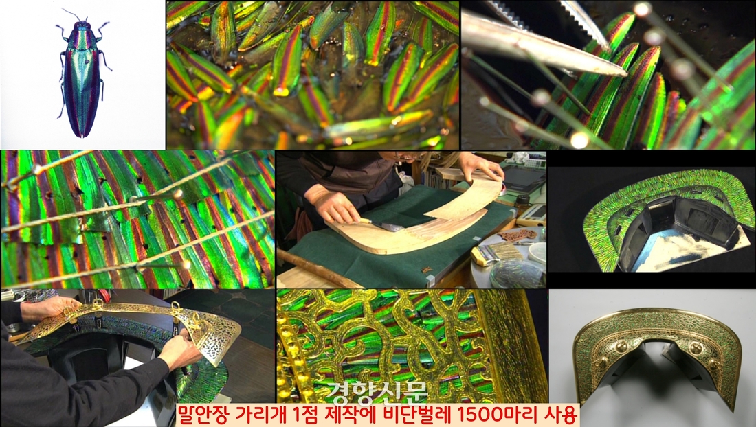 이 대목에서 짚고 넘어가야 할 것이 있다. 2006년 황남대총 남분 출토 말안장 뒷가리개의 복원 때 쓰인 비단벌레는 1500여 마리에 달했다.