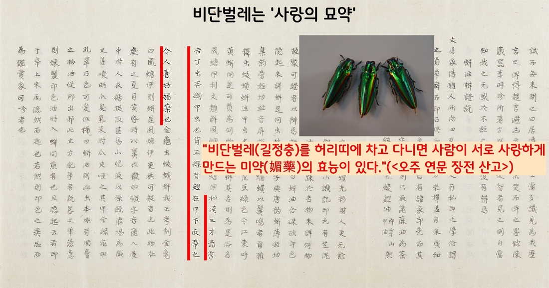 이규경의 <오주 연문 장전 산고>는 “비단벌레를 허리띠에 둘러차고 다니면 서로 사랑하게 만드는 미약(媚藥)의 효능이 있다”고 했다. ‘비단벌레=사랑의 묘약’으로 여긴 것이다.
