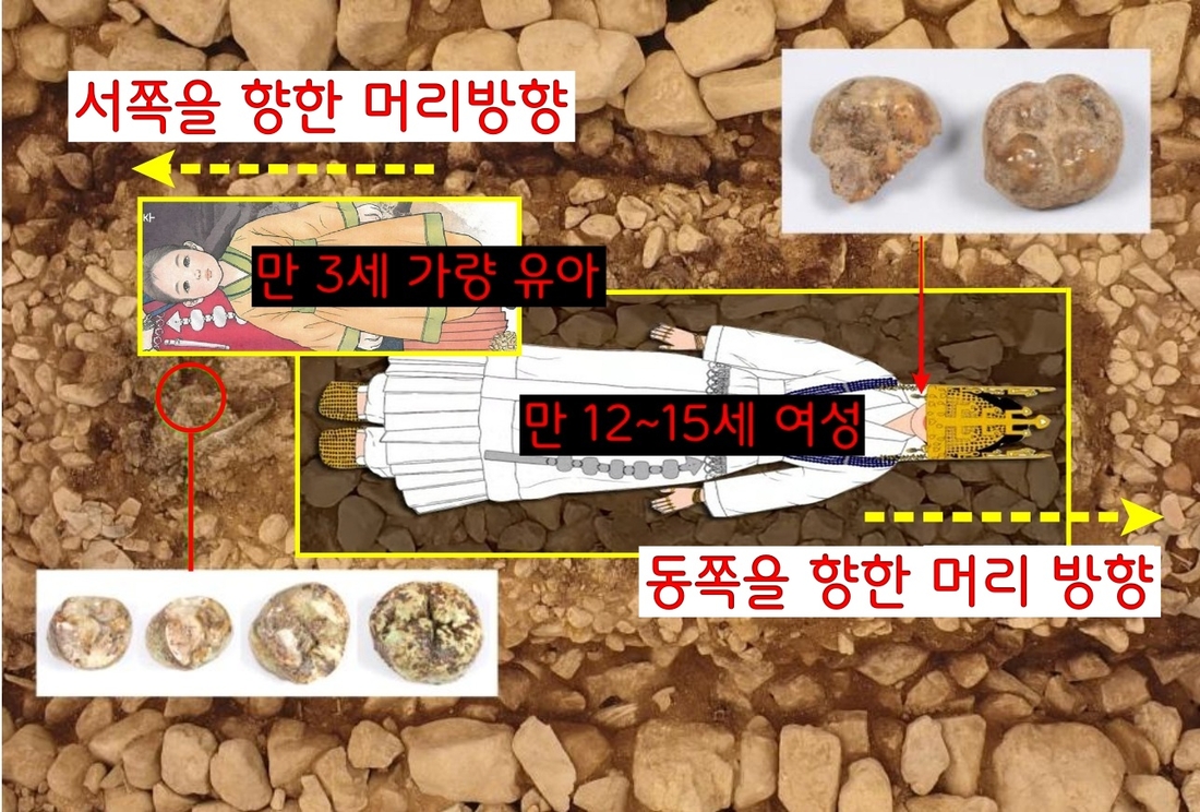 발굴단은 주인공(12~15세 여성)과 순장자(3세 전후의 아이)로 파악했다. 순장이라면 “502년(지증왕3) 순장을 국법으로 금했다. 이전에 국왕이 죽으면 남녀 각 5명씩 10명을 순장시켰다”는 <삼국사기>(‘지증왕’조)가 떠오른다. 120-2호분은 6세기 초반에 조성된 무덤으로 파악된다. 순장이 맞다면 12~15세 여자 주인공이 죽자 함께 묻힌 3세 전후의 아이는 국법으로 금한 순장의 마지막 희생자가 되는 셈이다.