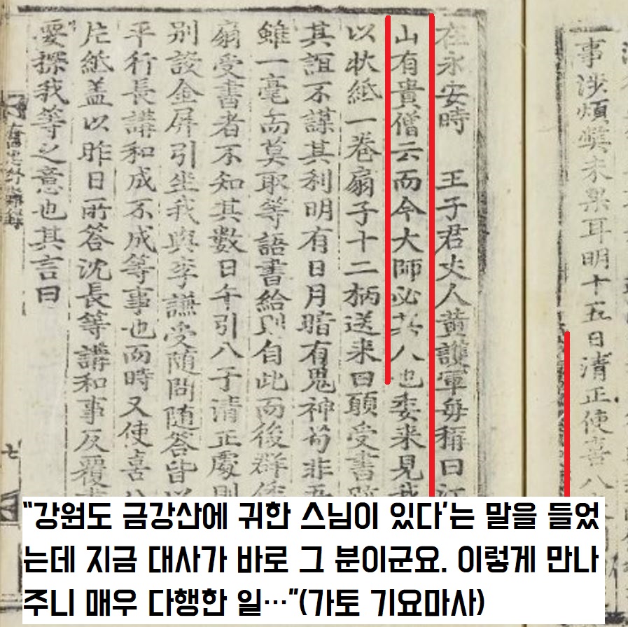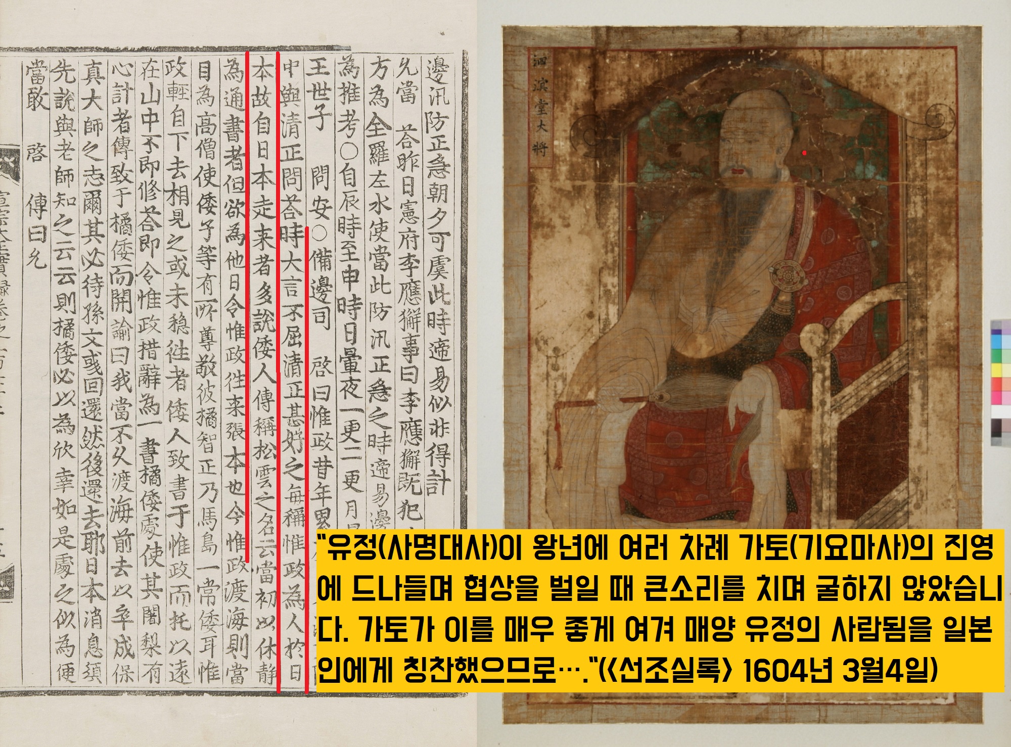 “유정(사명대사)이 왕년에 여러 차례 가토(기요마사)의 진영에 드나들며 가토와 협상을 벌일 때 큰소리를 치며 굴하지 않았습니다. 가토가 이를 매우 좋게 여겨 매양 유정의 사람됨을 일본인에게 칭찬했기 때문에….