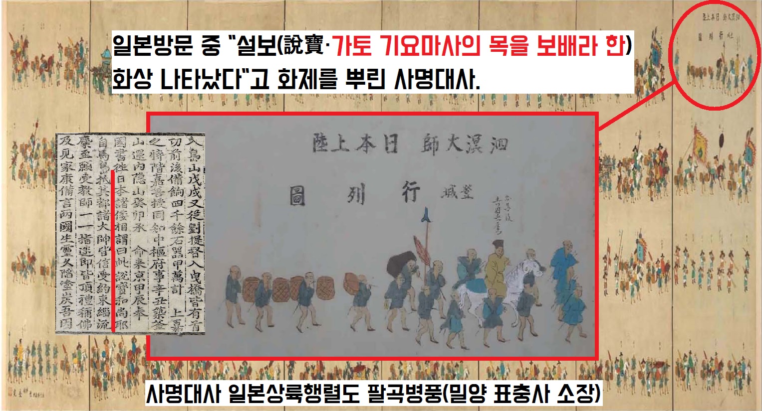 일본인들은 사명대사를 보자 “저 스님이 설보화상이다!”라고 환영하며 존경했답니다. ‘설보 화상’이란 사명대사가 일본 진영에서 가토 기요마사를 보고 “네 머리가 보배”라고 한 것에서 비롯됐습니다. 일본인들은 ‘보배를 그렇게 멋지게 설명한 스님이 어디있냐’고 엄지손가락을 치켜세운 거죠. 사명대사는 이때 일본의 유력인사 및 고승들과 교유했습니다.