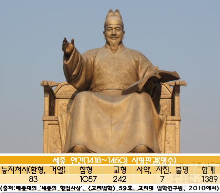 그런데 필자보다 먼저 집계한 연구자의 논문(배종대의 ‘세종의 형법사상’, <고려법학> 59호, 고려대법학연구원, 2010)이 있다. 그에 따르면 세종 재위(1418~1450) 중 ‘능지처사(참)’의 극형을 받은 사형수는 83명(1년 평균 2.6명)에 달했다.