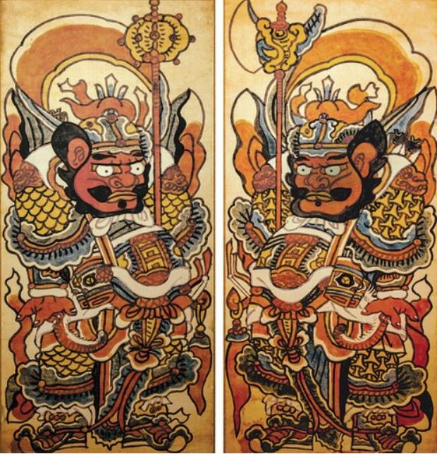 <동국세시기>는 “도화서가…황금빛 갑옷을 입은 두 장군상을 그려 바치는데, 길이가 한 길이 넘는다. 한 장군은 도끼를 들고, 또 한 장군은 절을 들었는데, 이 그림을 모두 대궐문 양쪽에도 붙인다”고 설명했다.