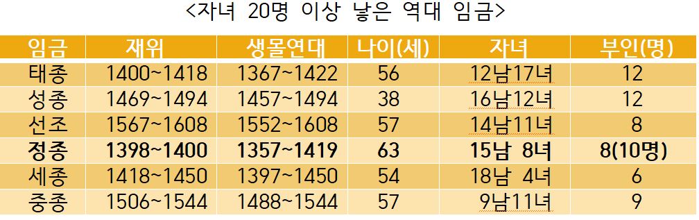 결국 자식들 간 피바람에 염증을 느낀 태조 이성계(재위 1392~1398)의 양위로 임금이 됩니다. 그러나 허수아비 임금일 뿐이었습니다. 그런데 1398년(태조 7년) 11월7일 <태조실록>에 묘한 기사가 등장합니다. 정종이 사가에 있을 때 첩이던 류씨를 후궁으로 들이고 아들을 자처하는 ‘불노’라는 인물을 갑자기 원자로 삼은 겁니다. 사실 정종의 정부인은 정안왕후 김씨(1355~1412)였는데요. 부부 금슬은 매우 좋았지만 자식은 두지 못했습니다. 정종은 대신 8명(혹은 10명)의 첩에게서 15남 8녀의 자식을 두었는데요.